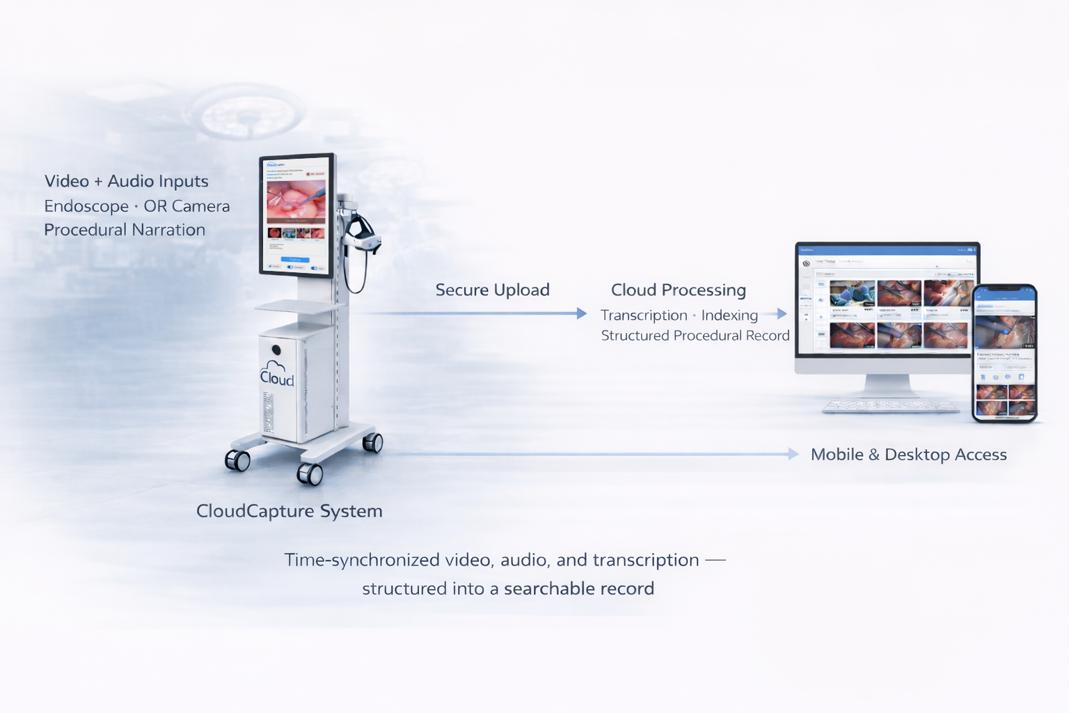 CloudCapture is the foundational module of the ZMED platform. It transforms live procedural activity into a structured, time-aligned case record — preserving synchronized video, audio, and transcription with indexed milestones and procedural metadata.